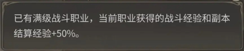 1)当我们拥有满级战斗职业时,其他战斗职业的战斗经验和副本经验都会增加50%,所以推荐大家在有满级战斗职业后再投入精力练第二个战斗职业。