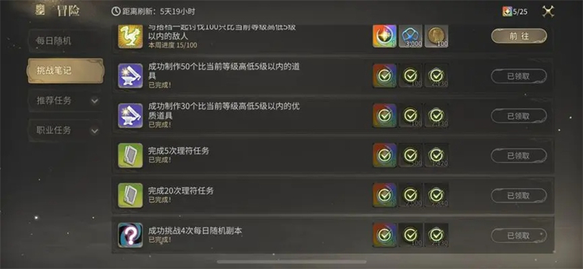 每周更新的挑战笔记中既可以通过挑战每日随机和临危受命获取战斗职业的额外经验,还能通过制作、采集、钓鱼、完成理符获取生产职业的额外经验,更新前记得查看一下是否已经领取。