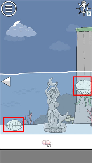 2、一共三个贝壳,贝壳里有三个珍珠,第一页有一个,第二页左下角和右边的水草里。第二页,珍珠给女神雕像最下方的三个孔,水升起来,第一页,拿剪刀,剪断穿上的绳子。