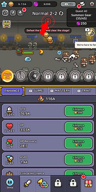 5、失败了也没关系,把手机放着挂机,史莱姆会自己成长,慢慢刷资源、变得更强大!