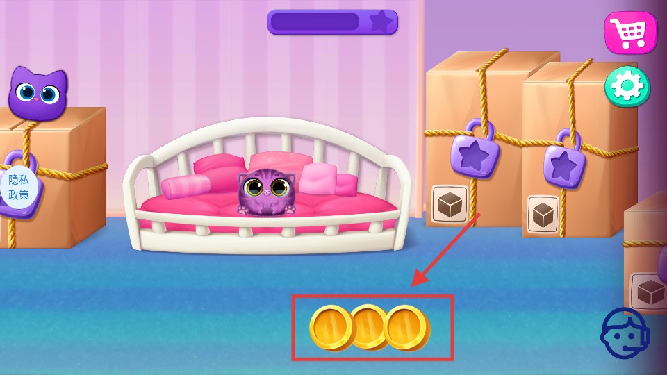 3、收集【金币】奖励,可用于解锁道具、装饰小屋或升级设施,助力萌宠经营发展。