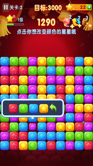点击单个星星即可消除,小关卡设计,多种变量不同关卡,增加游戏难度和趣味性。每次消除后,星星自动由下向上上升一行,当星星上升至最顶端时,游戏结束。