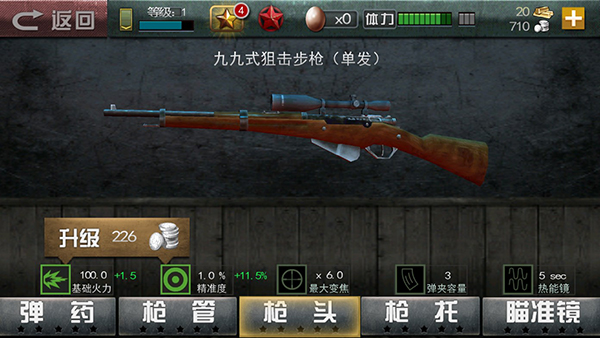 (1)武器是游戏内最重要的玩法,很多主线剧情都需要用到不同的武器,游戏内的武器分为狙击枪、冲锋枪、重机枪三种,其中冲锋枪需要18金砖获得4000银币解锁,重机枪需要199金砖或者25221银币解锁。