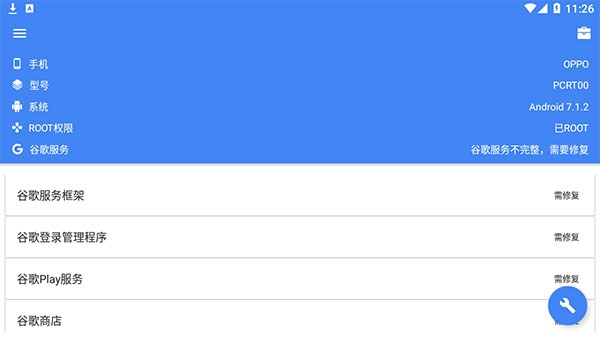 2、点击下方首页右下方的扳手,即可对谷歌服务进行修复