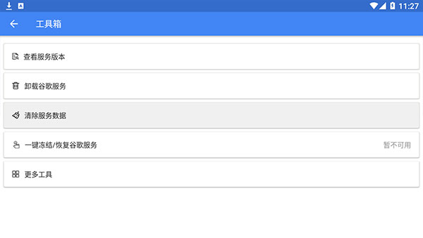 3、点击右上方的工具箱菜单,有查看版本,卸载谷歌三件套,清除数据等功能