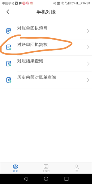 3、如果是双人对账模式,则手机银行操作员二也登录app进入首页点击“手机对账”,然后再点击“对账单回执复核”