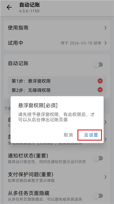 5、之后去授权悬浮窗权限,点击【去设置】,找到钱迹App开启权限就完成了。