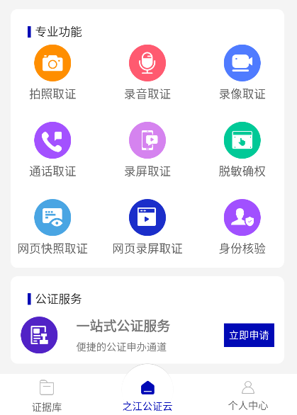 之江公证云官网版app一款针对线下取证场景的专业取证工具,包含拍照取证,录像取证,录音取证、通话取证、录屏取证、在线公证产品功能。全场景覆盖,随时随地留存证据,侵权取证无一遗漏;司法公证+区块链技术双重背书,证据实时上链防篡改。适用多场景取证,满足不同取证需求,提供专业化服务为您的维权道路保驾护航。